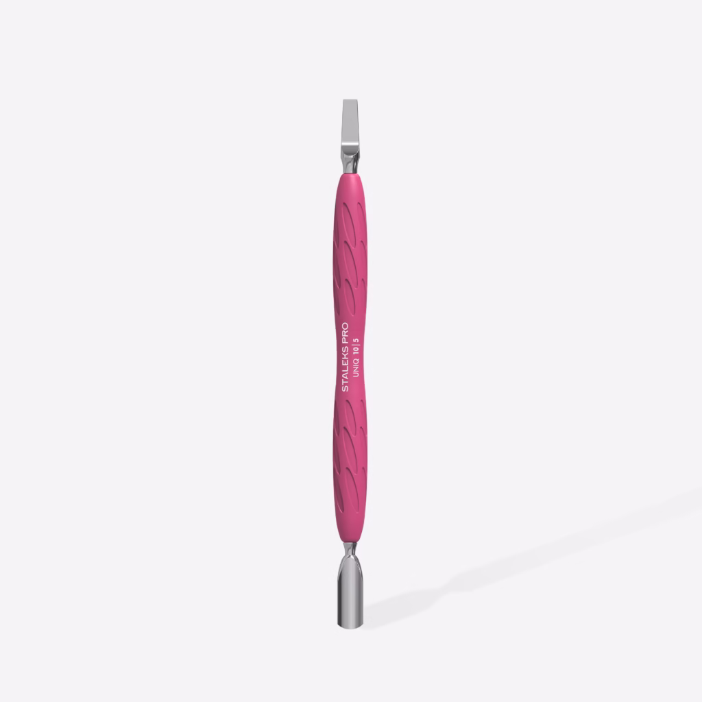 Zatláčadlo na manikúru Gummy so silikónovou rukoväťou UNIQ 10 TYP 5 (zaoblené úzke zatláčadlo a rovná čepeľ)